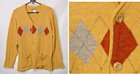 ■濃いベージュ、毛100、日本製、ボリュームのある中厚な感じ、胸に茶・グレーのアーガイル模様のライン、前すそ左右ポケット、