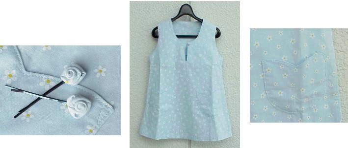 ■ 水色のジャンパースカート ■サイズ100、白い小花もよう入り、くるみボタン、ポケットはチューリップ型 ■花のヘアピン2つのおまけ付き、着丈52.5 |