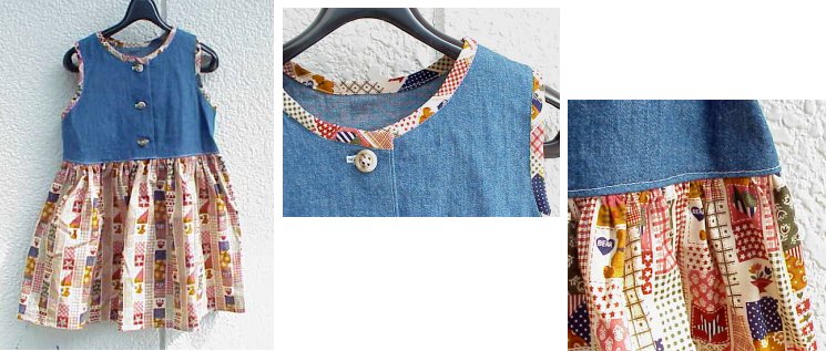 \1,800/■サイズ120、身頃デニム地の紺、スカート部茶系のカントリー柄