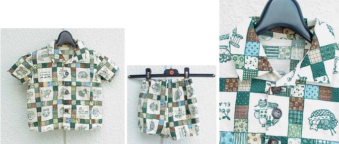 ■サイズ80〜90、きなり地に緑、前ボタン開き、ウエストゴム、ボタンがいっぱい、衿もとがかわってます