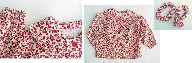 ■シュシュ付き。かわいいお花のプリントブラウス。赤いボタンがきいています。