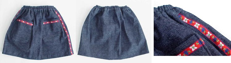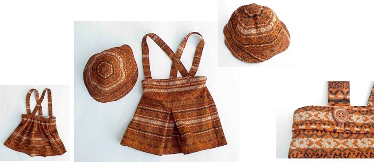 ■オレンジ色と、ジャガード柄がかわいい吊りひもスカート。ボタンでサイズ調節可。おそろいの帽子つき