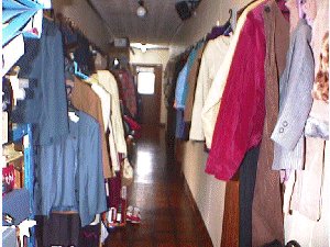 右に曲がると、向こうの方になにやらあやしげな階段、洋服が見えます。