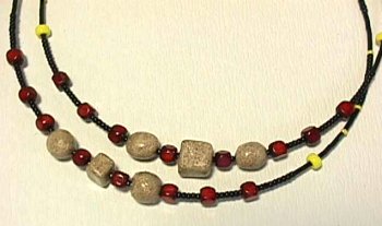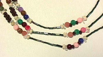ビーズで作ったネックレス、ピアスと麻ひもで編んだブレスレットなどで、